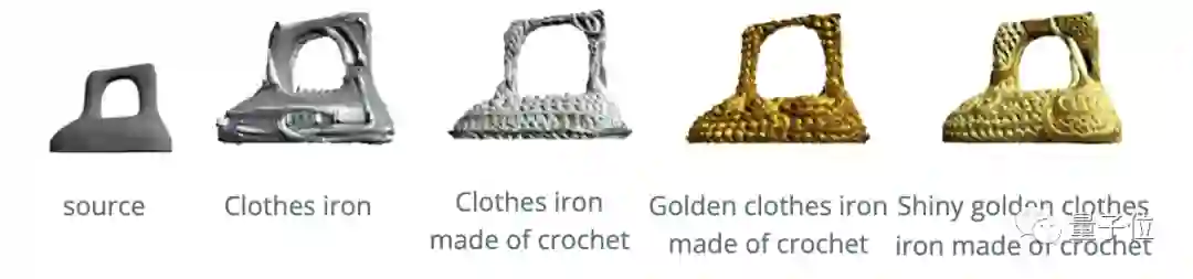 比如“由钩针编织成的闪亮的金色衣服熨斗”: