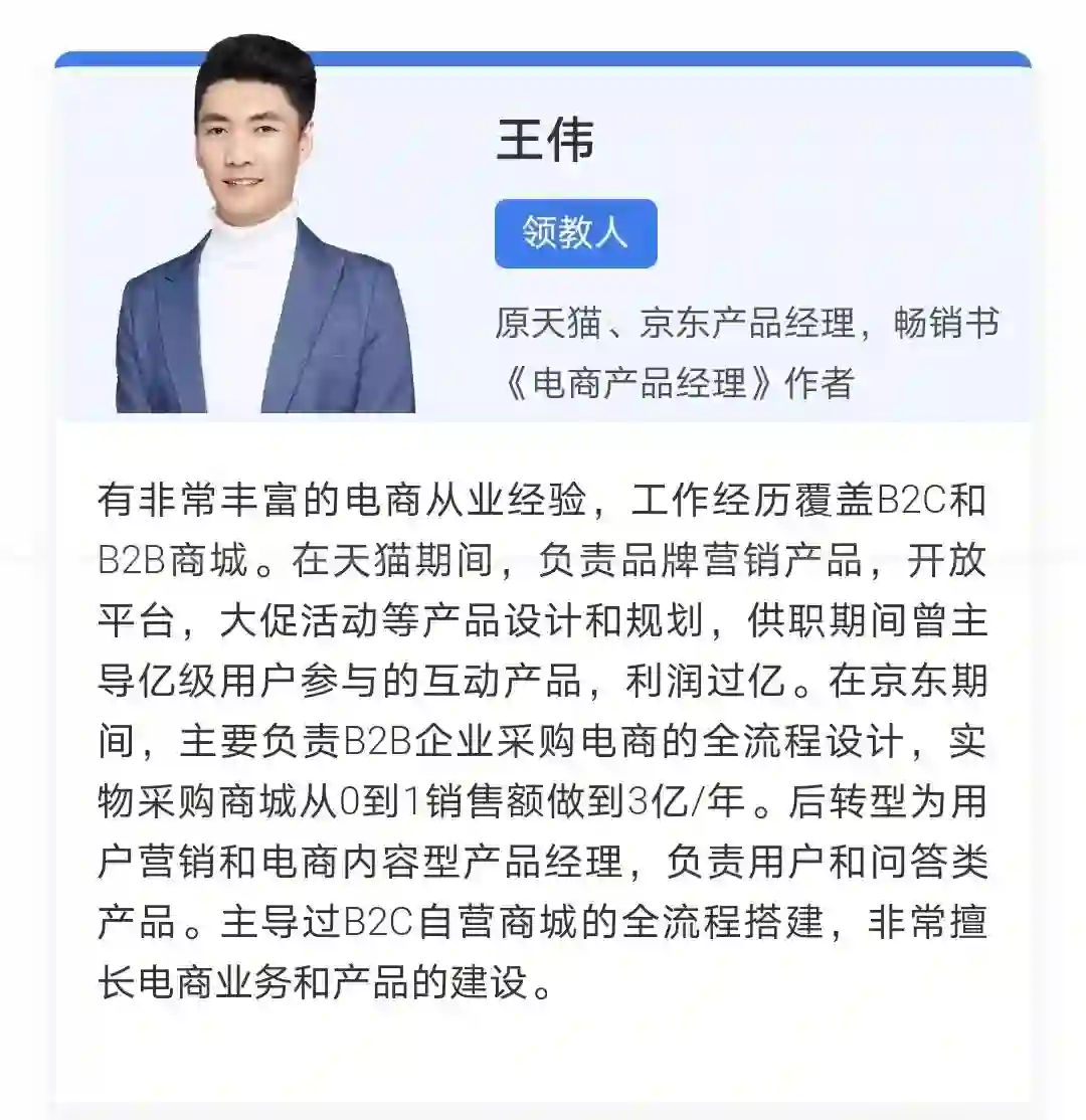 为此,人人都是产品经理旗下起点课堂,邀请前天猫/京东产品经理、畅销书《电商产品经理》作者王伟老师,带来了大厂规范化的电商产品经验、以及大厂电商产品经理的能力框架。