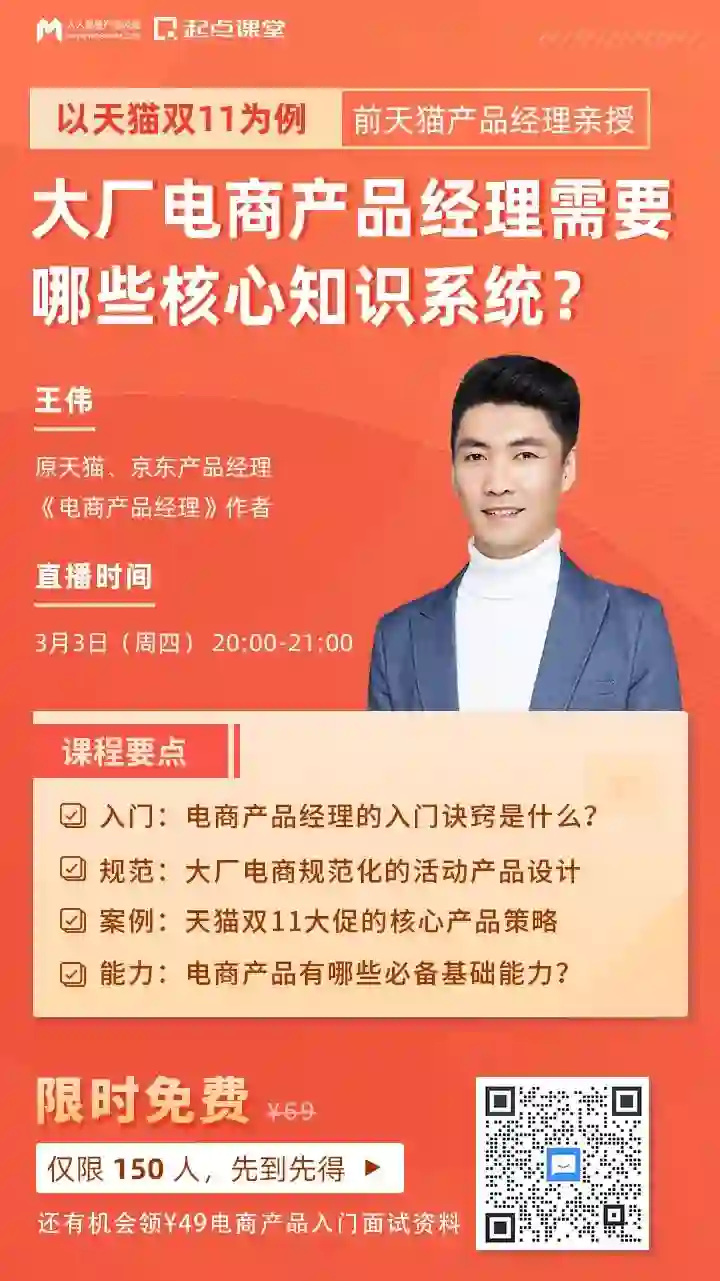 3月3日(周四)晚8点,王伟老师将从天猫双11等案例,拆解大厂电商产品经理的核心知识系统,助你更快系统入门电商产品经理!
