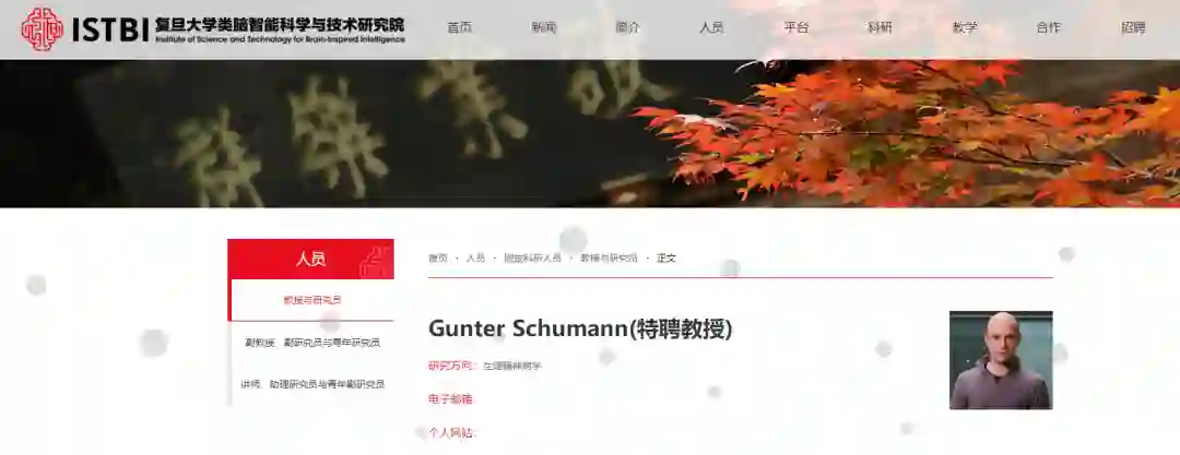 目前,复旦大学类脑智能科学与技术研究院的官网上显示,Gunter Schumann(冈特·舒曼)已经在类脑智能科学与技术研究院的「固定科研人员—教授与研究员」名单中,并且已成为该研究院的特聘教授。