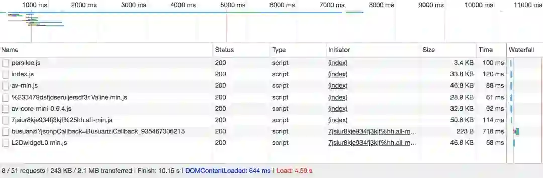 可见,请求时间是 4.59 s ,总请求个数 51 , 而 js 的请求个数是 8 , css 的请求个数是 3 (其实就 all.css 一个,其它 2 个是 Google浏览器加载的), 而没使用 压缩、合并 时候,请求时间是 10 多秒,总请求个数有 70 多个, js 的请求个数是 20 多个 ,对比请求时间 性能 提升 1倍 多。