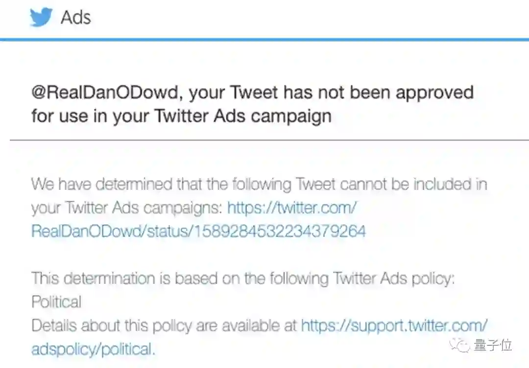 在该组织提供的电子邮件截图中,推特表示,这条推文违反了其关于政治广告的政策。