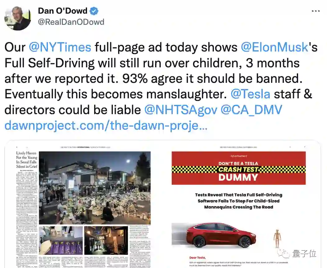今年8月,该组织“黎明计划”(The Dawn Project)曾在《纽约时报》上刊登了一整版广告,批评特斯拉的自动驾驶系统FSD。