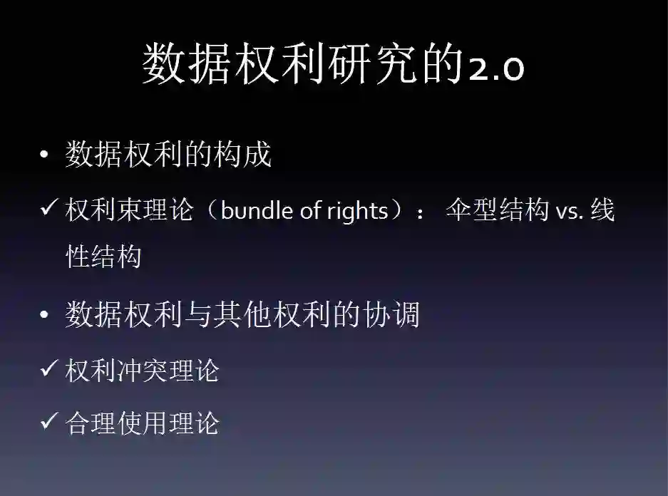 中层理论的基础上,我想提出对数据权利进一步研究的一些想法。举例而言,就数据权利化问题,可以使用“可登记财产利益理论”;就数据归属问题,可以使用“捕获理论”和“密切关联理论”;就数据权利的构成,可以使用权利束理论;就数据权利不同主体之间的关系,可以使用“信义关系理论”;就数据权利和其他权利之间的处理,可以使用“权利冲突理论”和“合理使用理论”。