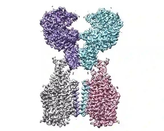 第一步,他们要获取ACE2蛋白全长蛋白,但作为膜蛋白的ACE2本身很难在体外稳定获得。研究人员在文献中发现ACE2与肠道内的一个氨基酸转运蛋白B0AT1能够形成复合物,根据过去研究氨基酸转运蛋白复合物的研究经验,他们判断,这个复合物极有可能稳定住ACE2。果然,他们通过共表达的方法获得了ACE2与B0AT1优质稳定的复合物,并利用西湖大学的冷冻电镜平台成功解析了其三维结构,如下图: