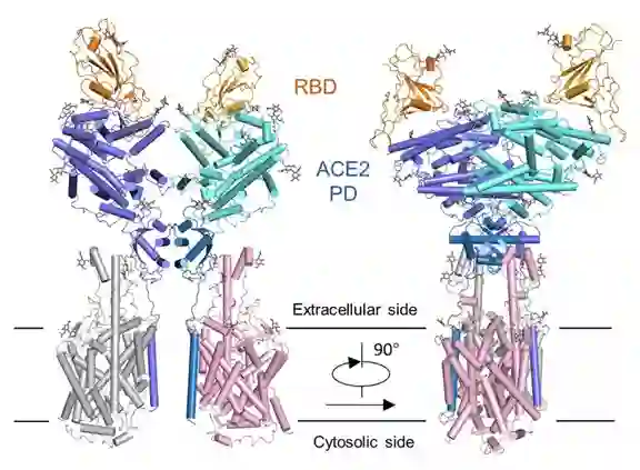 上面的蓝色和灰白色部分,是ACE2的两个结构PD(肽酶结构域,peptidasedomains)和CLD(Collectrin样域,Collectrin-like domain)。