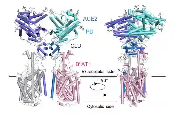 科学家们正在正在争先恐后地研究严重急性呼吸系统综合症“新冠病毒2(SARS-CoV-2)”的秘密,这是大流行性疾病COVID-19的起因。病毒进入的第一步是病毒的三聚体棘突蛋白与人类受体血管紧张素转化酶2(ACE2)的结合。Yan等人提出了人类ACE2的结构及氨基酸转运蛋白B0AT1的复合物。在这种情况下,ACE2是二聚体。进一步的结构显示了SARS-CoV-2的受体结合区如何与ACE2相互作用,表明两个三聚体棘突蛋白可能与ACE2二聚体结合。这些结构为开发针对这种关键相互作用的疗法提供了基础。