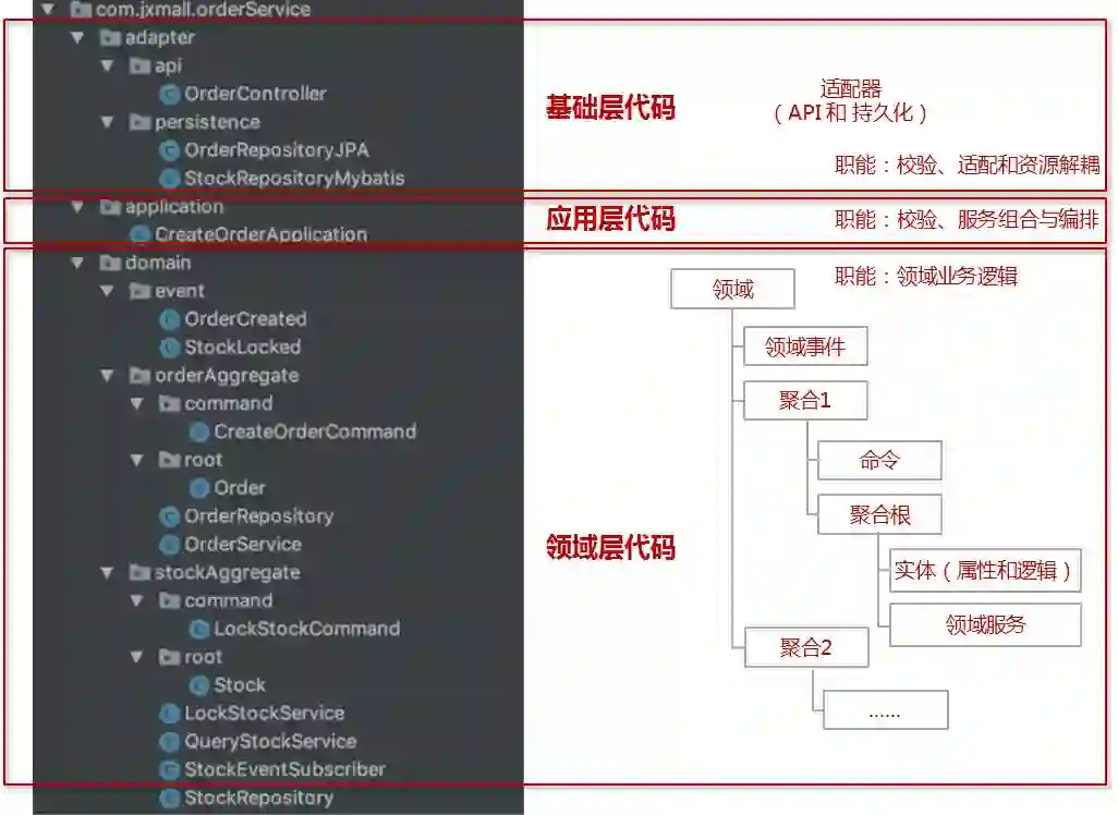 领域层代码:本层代码主要实现核心的业务领域逻辑,需要做好领域代码的分层以及聚合之间代码的逻辑隔离。相关的开发方法请查阅 DDD 战术设计相关资料,并遵循相关设计和开发规范。