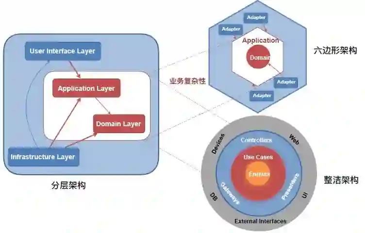 虽然整洁架构、六边形架构以及 DDD 分层架构三种架构模型展现方式以及解决问题的出发点不一样,但其架构思想与微服务架构高内聚低耦合的设计原则高度一致。