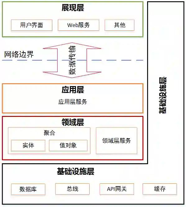 基础设施层:它向其他层提供通用的技术能力,为应用层传递消息(API 网关等),为领域层提供持久化机制(如数据库资源)等。