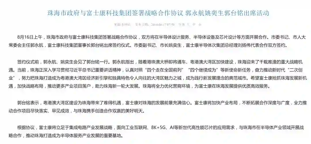 根据珠海市政府官网消息,8 月 16 日上午,珠海市政府与富士康科技集团签署了战略合作协议,双方将在半导体设计服务、半导体设备及芯片设计等方面开展合作。