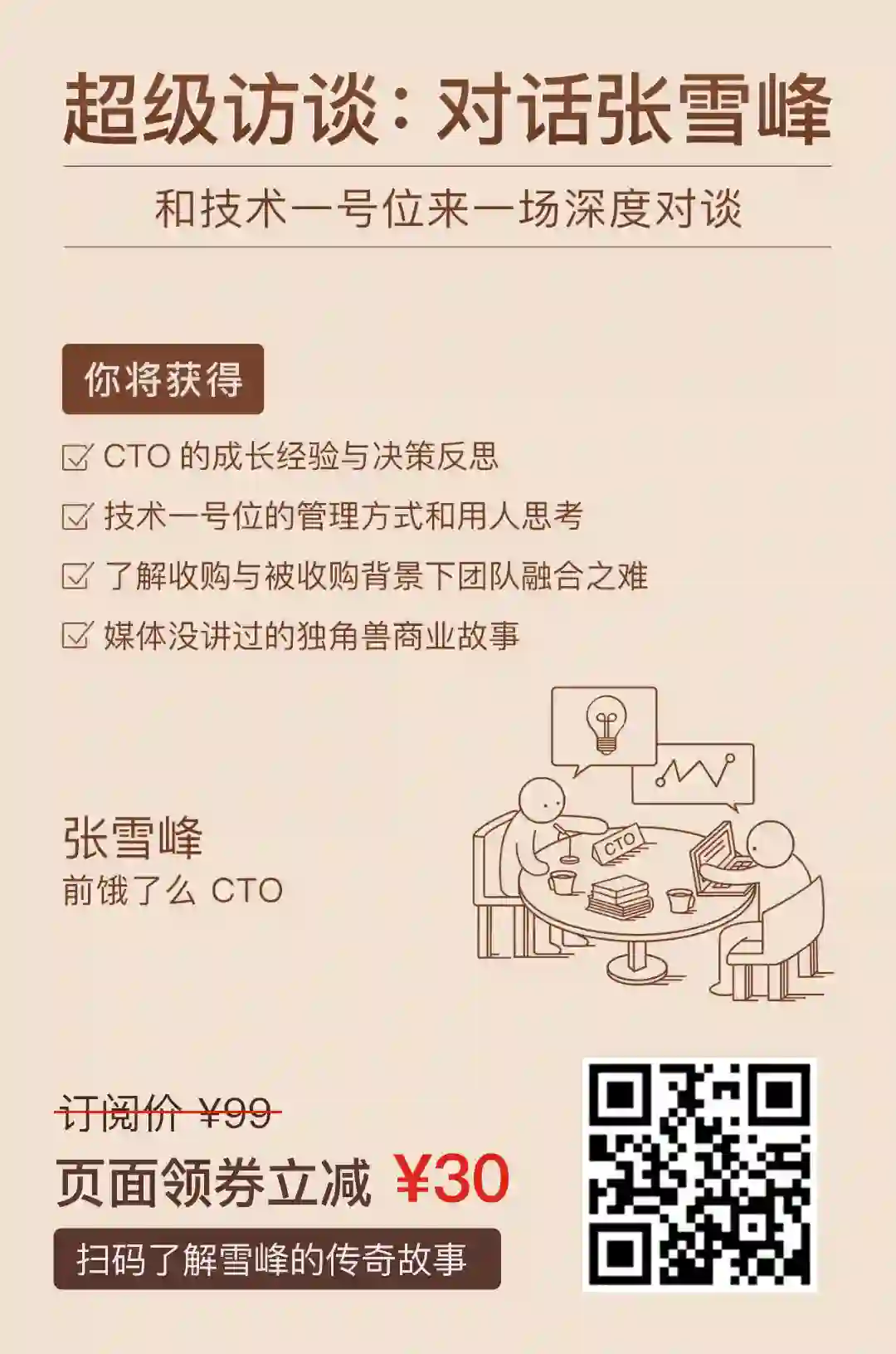 如专栏名字,呈现形式也很新鲜,这是通过对话而产生的一份采访记,通过 100+ 个问题,复盘他作为 CTO 的职业成长经历、做事方法、管理经验以及个人反思,还有饿了么发展“背后的故事”,比如:因为宕机被一线销售骂、收购百度外卖后不同团队的冲突、差点裁员的经历、CTO 的狼狈时刻等等。