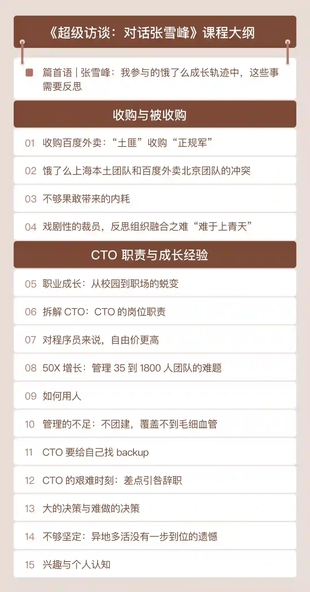 要知道近 1 年张雪峰已经处于“半归隐”状态(饿了么并入阿里 2 年后离职,也不再接受采访),这些一手的经验实在是难得可贵,所以第一时间,我就去极客时间上读了《超级访谈:对话张雪峰》专栏,只能说,大佬不愧是大佬。