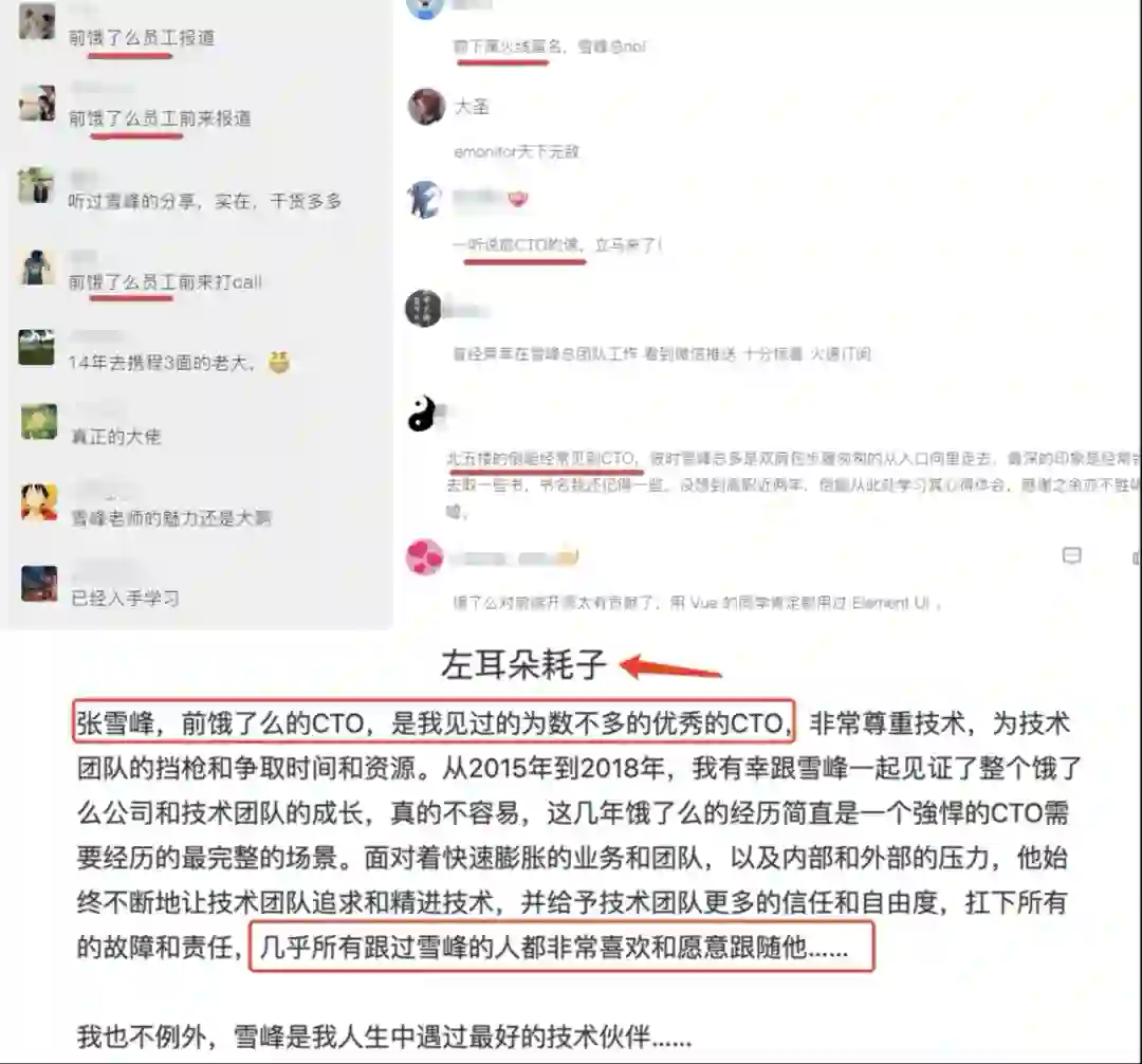 而且他也影响了很多人,在专栏《超级访谈:对话张雪峰》上线后,一直有或前或现役的饿了么员工“前来报道”,由此又印证了 雪峰大佬“虽远离江湖,但江湖仍有他的传说”这件事。我摘录了一些“追随者”的评价,时至今日我隔着屏幕都能感受到他们的“长情”: