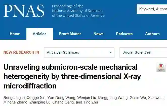 在国家自然科学基金项目(项目编号:51527801、51471032、51231002)等资助下,北京科技大学新金属材料国家重点实验室王沿东教授团队与美国阿贡国家实验室LiuWenjun博士、佐治亚理工Zhu Ting教授等研究者合作,开展金属材料疲劳形变亚微米尺度应力分布原位研究,揭示了疲劳剪切带损伤的微观机制。研究成果以“Unraveling Submicron-scale mechanical heterogeneity by three-dimensional X-ray microdiffraction”(三维X射线微衍射技术揭示亚微米尺度形变与损伤不均匀性)为题,在Proceedings of the National Academy of Sciences of the United States of America (PNAS)上发表。
