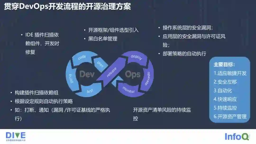 微众一直在致力于建设贯穿 DevOps 开发流程的开源治理方案。在整个阶段有开源框架和组件选型的评估,同时有整个公司的开源软件的黑白名单管理;在开发阶段开发了 IDE 插件工具,能够非常方便地自主扫描所开发系统的组件依赖关系,并且可以根据治理策略及时给开发同学各种提醒和帮助,使开发侧能够更及时处理修复问题。在构建测试阶段会做自动触发的依赖扫描,根据设定的规则自动执行各种策略。在生产部署环节有针对性的安全漏洞审查,以及生产部署策略的自动执行。