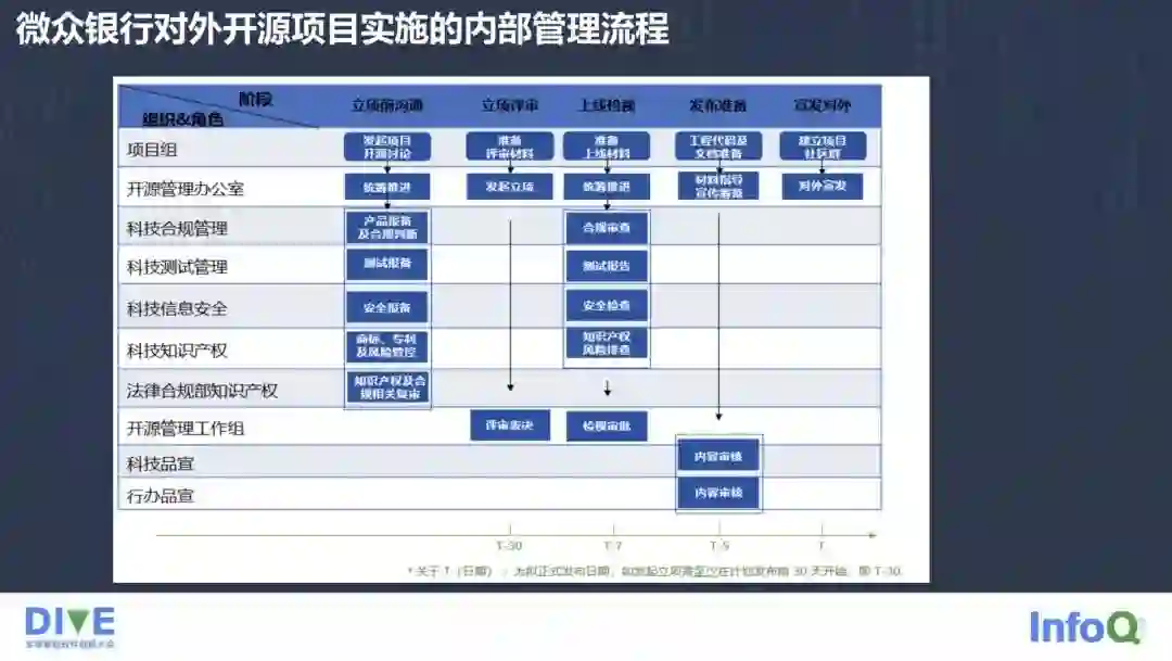 上图是微众银行对外开源项目的内部管理流程图。图中的流程和步骤都拆得非常细致,并且每个步骤都有清晰的输入输出标准,也有很多模板供大家参考。只要团队想要发起一个开源项目,就能比较系统地了解要做的事情和关注的方面,沟通就更为成熟,质量也有一定的保障。