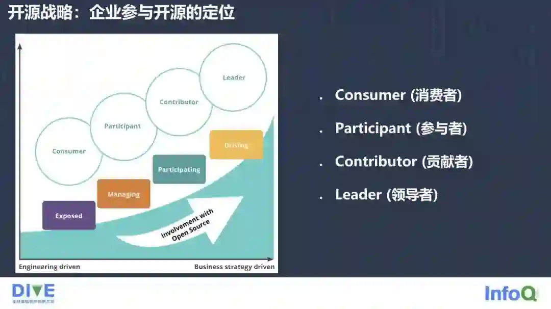 根据 Linux 基金会的模型,企业引入开源的模式可以定义为阶梯型的策略。在消费者阶段,企业主要关注如何用好开源软件;参与者阶段,企业会参与社区活动,更深入了解所使用的开源软件;贡献者阶段,企业可能参与上游贡献、自己发起开源项目等;领导者阶段,企业会在社区发挥重要的领导作用,影响相关技术或组织的发展,并成为某些开放标准的制订者。
