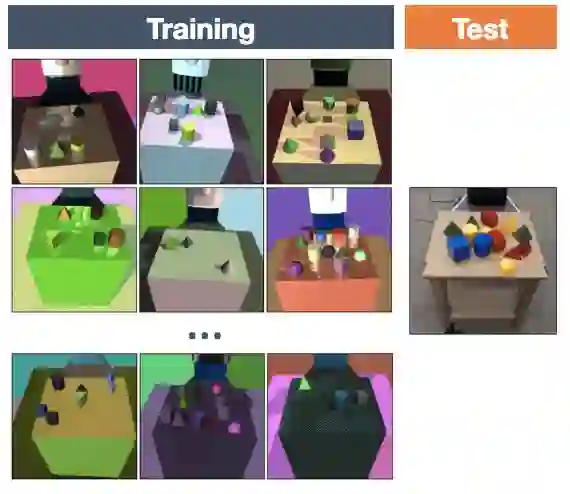 后一种方法称为域随机化。下图来自Tobin等人在2017年的论文中很好地说明了这一想法: