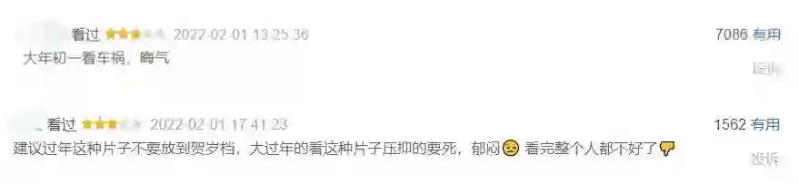 而在今年,《水门桥》提供了这种观影体验,《奇迹》也对观众的情绪有所触动,但口碑排名目前垫底的《四海》,则是不太符合春节观影氛围的代表,在影片的豆瓣热评中,有人吐槽“大过年的看这种片子,压抑、郁闷,看完整个人都不好了”。这种观影感受,直截了当地体现在了豆瓣5.6分的评分上,相较于春节档其他影片,谷底的位置十分稳固,这也会直接影响后续影片的票房走势。