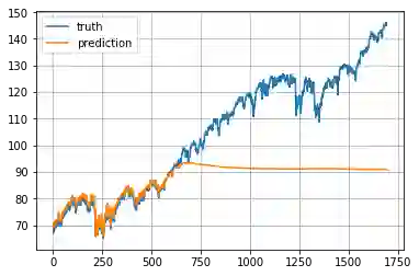 标准普尔500指数随着时间的推移而增加,导致测试集中大部分数值超出训练集的范围,因此模型必须预测一些以前从未见过的数字。 但这却不是很理想。