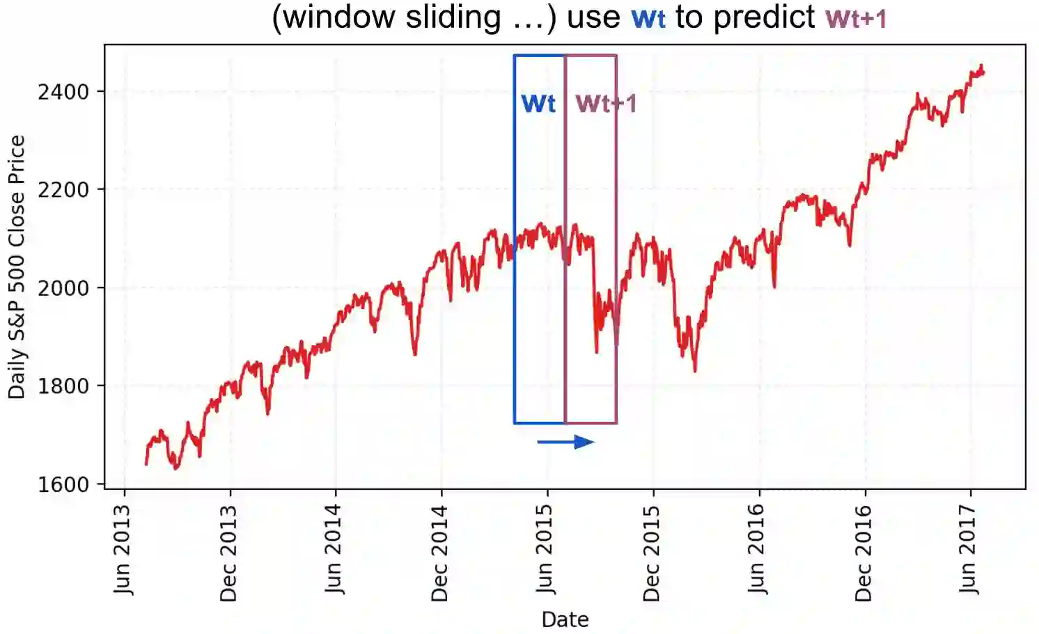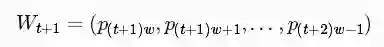 股票价格是长度为NN,定义为p0,p1,...,pN-1,其中pi是第i天的收盘价,0≤i<N。 我们有一个大小固定的移动窗口w(后面我们将其称为input_size),每次我们将窗口向右移动w个单位,以使所有移动窗口中的数据之间没有重叠。
