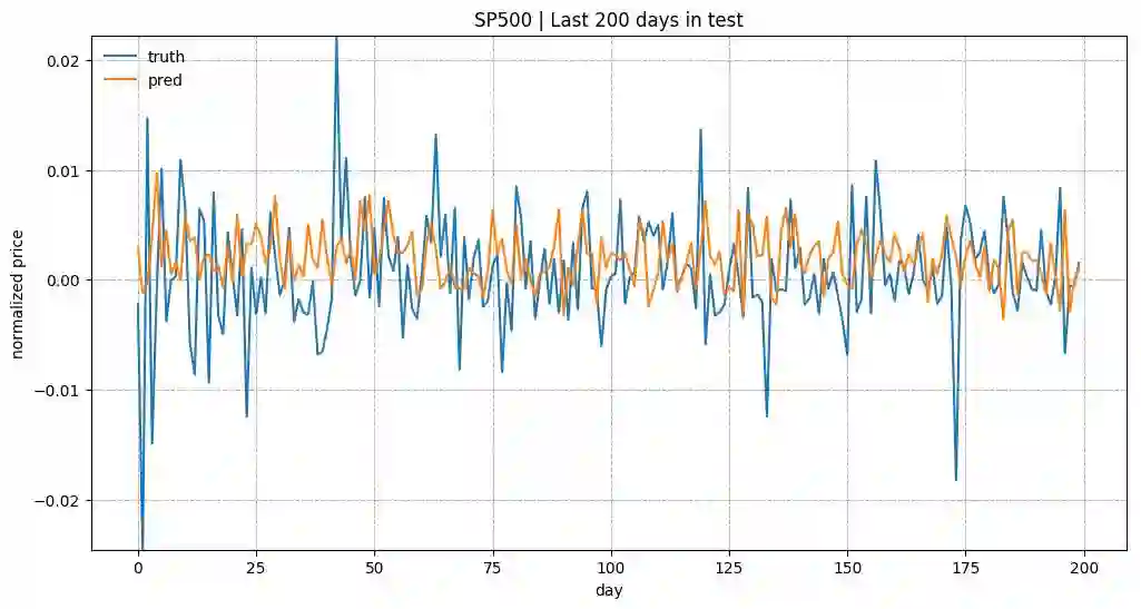测试数据中最近200天的预测结果。 模型是用 input_size= 5 和 lstm_size= 128 来训练的。