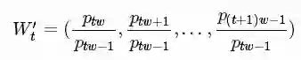 为了解决样本外的问题,我们在每个移动窗口中对价格进行了标准化。 任务变成预测相对变化率而不是绝对值。 在t时刻的标准化滑动窗口W't中,所有的值除以最后一个未知价格 Wt-1中的最后一个价格: