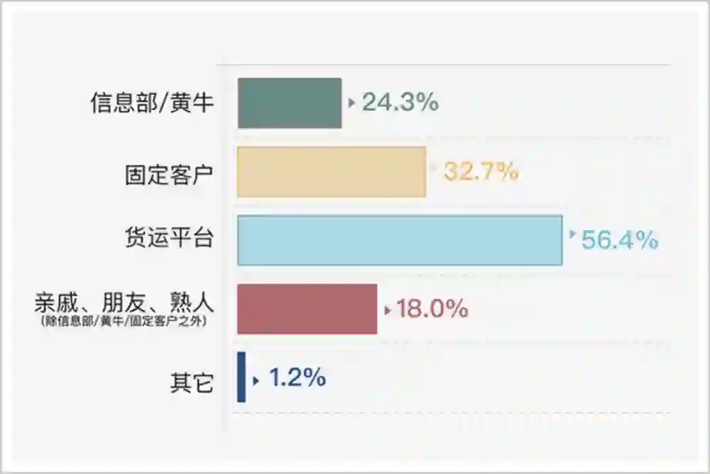 根据一项调查显示,30%的卡车司机有固定货源,超过56.4%的卡车司机,则需要通过平台寻找货源。