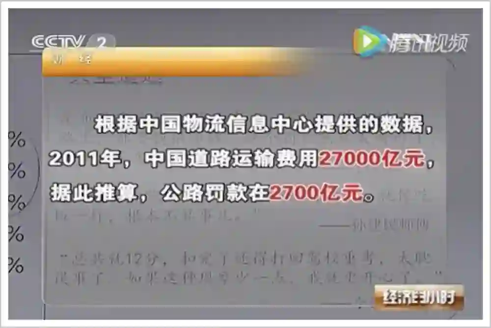 公路罚款约占到司机运费收入的10%,按照当年中国道路运输总费用计算,2011年公路罚款2700亿元。