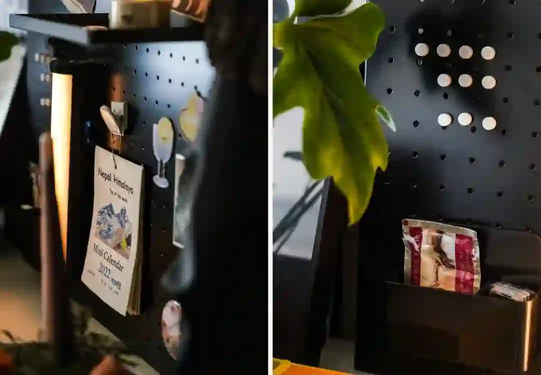 前段时间为了改造自己卧室的电竞区域,参考了许多网上的桌面搭配,「洞洞板」的出镜率竟意外的高。扩展性与收纳潜力的强大,除了电竞氛围,也很适合用在露营装备收纳与艺术装饰之中,于是决定也购置一块放在家里。最初其实是在线下的宜家买的斯考迪斯洞洞板,36cm x 56cm 的米白色版本,也采购了配套的弹力绳和一些挂钩。到家搭建起来总觉得和想象中有些许落差,尺寸有些小,和工作台风格也不算适配,整体来说还是太过「居家」,于是就收纳起来挪作他用。也终于意识到自己可能还是需要一块更大、质感更「硬」的板子,在某书上又做了一些检索和寻觅,最后选了 oroliving 的黑色金属洞洞板,50.5cm x 71.5cm,尺寸终于是对了。但另一个尴尬点随之而来,原先计划在卧室打孔上墙放置,结果自己买的钻孔机似乎功率不太够,钻不了太深,而且铁质板材的重量比想象中更沉,担心损坏墙面,最终还是决定立在桌面,靠墙使用。开始装饰时才发现自己没有足够多的数码器材,完全填不满,还是暂且做成装饰性洞洞板,用来收纳自己收集的纸质材料。包括冰箱贴,美术馆导览手册,迷你装饰画和朋友寄来的明信片等等。宜家配件的规格与洞眼和这款并不适配,虽然他们店内也出售各种颜值相当高的配件,但我为了节约成本还是决定自己寻觅「平替」款。铁质洞洞板最大的优势就是兼容磁吸材料,所以通过检索比如「冰箱置物架」、「磁吸笔筒」、「磁吸夹」之类的关键词我找到了不少物美价廉的配件,带有功能性的冰箱贴也完全可以使用。另外我的摄影用 LED 灯棒也自带磁吸套,索性也固定在了洞洞板上,可以通过 APP 调整光强和色温,远距离看挺像以前的古早电气灯。在此之前我的徽章和胸针都是单独收纳在一个小盒子里,正准备一个个通过洞洞板洞眼固定并且把旋扣固定在板后时,意外发现买的平替置物架底部的长条形镂空槽正好可以收纳,这样就不用每次取胸针都需要转动板材(因为真的挺沉的),属于意外之喜。实不相瞒,最初对洞洞板的幻想还是网络上那些固定有发光灯板、游戏手柄和各种磁吸数码配件的 Tech Wall 氛围担当,但现在的艺术板也不错,等之后数码器材多了再作迁移也不迟。