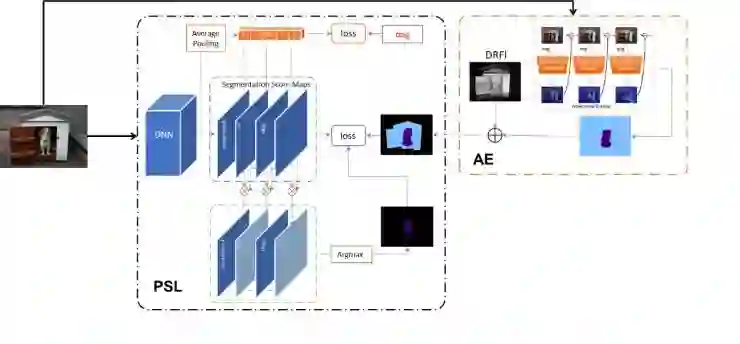 我们利用显著性检测技术生成的显著图生获取图像的背景信息,并同通过对抗擦除获得物体区域结合生成用于训练语义分割网络的segmentation mask(其中蓝色区域表示未指派语义标签的像素,这些像素点不参与训练)。由于在生成的segmentation mask中包含了一些噪声区域和未被标注的区域,为了更加有效地训练,我们提出了一种PSL(Prohibitive Segmentation Learning)方法训练语义分割网络,如图7。该方法引入了一个多标签分类的分支用于在线预测图像包含各个类别的概率值,这些概率被用来调整语义分割分支中每个像素属于各个类别的概率,并在线生成额外的segmentation mask作为监督信息。由于图像级的多标签分类往往具有较高的准确性,PSL方法可以利用分类信息来抑制分割图中的true negative区域。随着训练的进行,网络的语义分割能力也会越来越强,继而在线生成的segmentation mask的质量也会提升,从而提供更加准确的监督信息。
