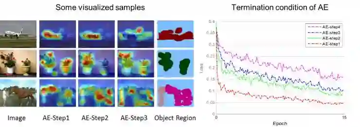 我们发现在实施第四次擦除后,网络训练收敛后的loss值会有较大提升(图6右)。主要原因在于大部分图片中的物体的区域已经被擦除,这种情况下大量的背景区域也有可能被引入。因此我们只合并了前三次擦除的区域作为图片中的物体区域。图6左给出部分训练图像在不同训练阶段挖掘出的物体区域,以及最后将擦除区域合并后的输出。