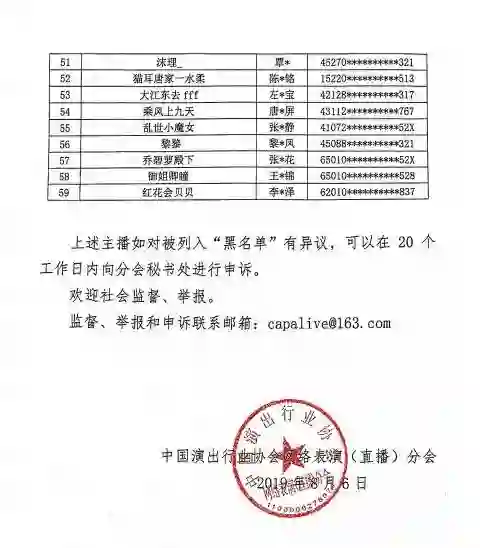 中国演出行业协会网络表演直播分会官方微信公众号消息,根据《网络表演行业主播“黑名单”管理制度》,中国演出行业协会网络表演分会现向社会公布第三批主播黑名单,被列入黑名单的主播将在行业内禁止注册和直播,封禁期限5年。