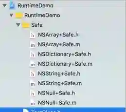 我们先创建一个测试Demo如下图,其中TestClass是一个测试类,TestClass+Category是它的一个分类,NSObject+Runtime封装了一些Runtime的方法。大家可以在这里下载Demo。
