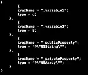 下面这个方法就是获取类的成员变量列表,其中包括属性生成的成员变量。我们可以用ivar_getTypeEncoding()来获取成员变量的类型,用ivar_getName()来获取成员变量的名称: