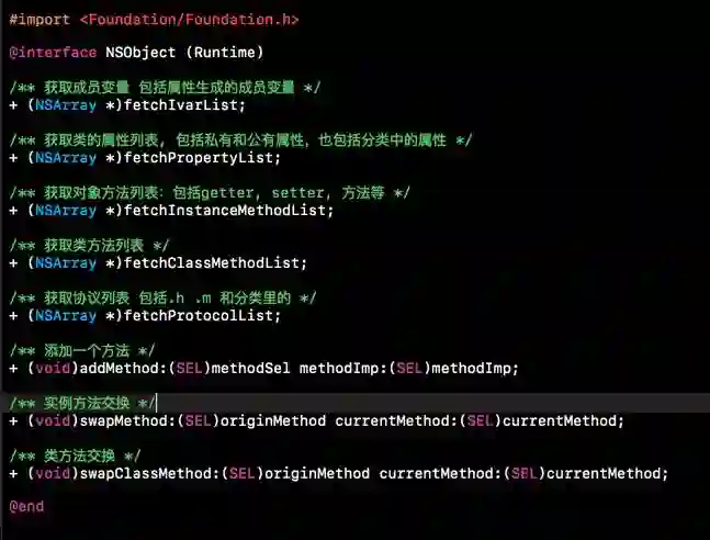 接下来我们就来看看NSObject+Runtime中的内容,其对Runtime常用的方法进行了简单的封装: