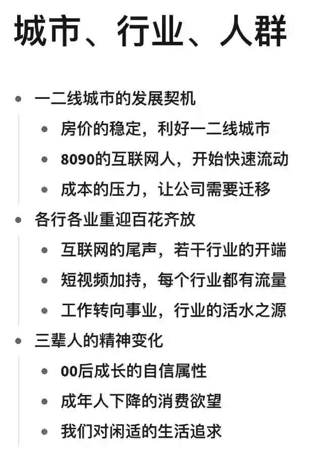 现在,我们不聊数据聊现状,聊聊我对城市、行业、人群的三个预判。