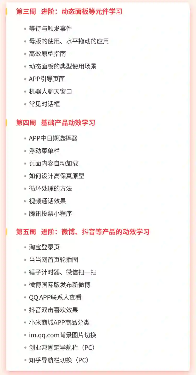 在前2周功能基础掌握的情况下,你会系统学习到web端、手机端的产品交互动效,进阶学习切换、拖动、平滑等15+个进阶效果