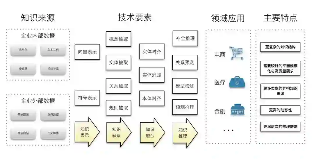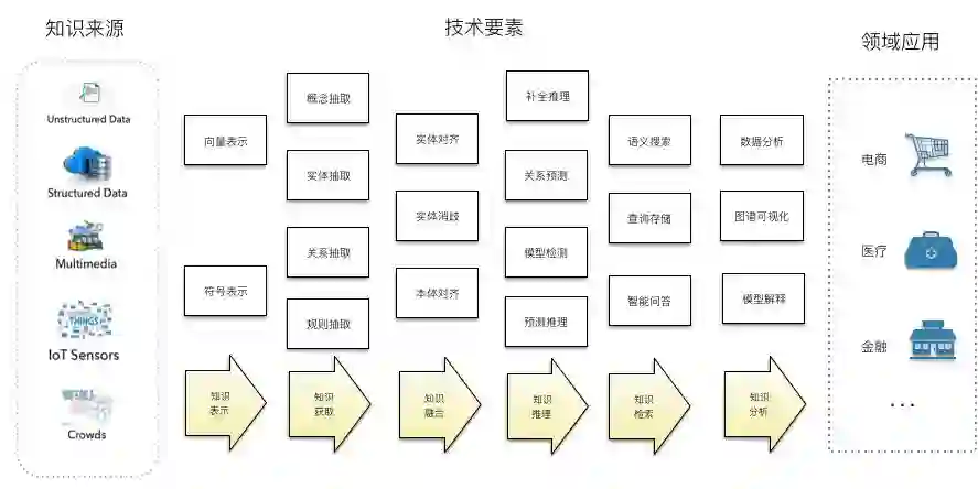 知识图谱的规模化构建需求对知识获取带来如下几个方面的变化:1)从单一人工获取到更多的依靠大数据和机器学习来实现自动化知识抽取;2)从单一来源变化为综合从结构化、半结构化、文本、传感器等多个来源,通过多任务相融合实现联合知识获取;3)从依靠少数专家到依靠互联网群体众包协同获取。