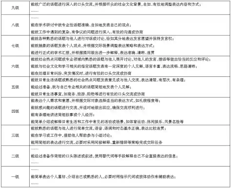 表1 《中国英语能力等级量表》之口头表达能力标准
