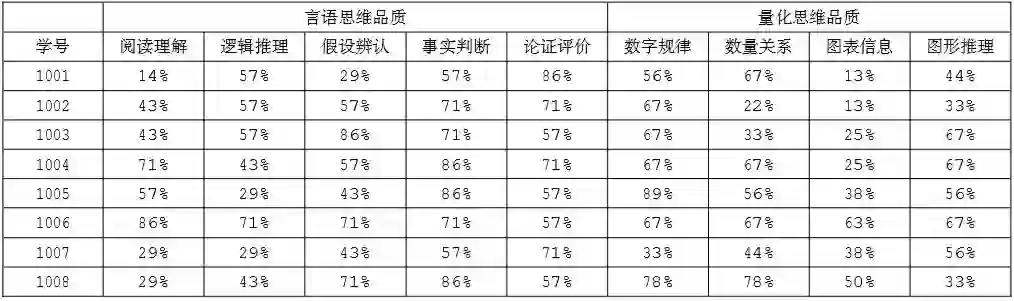 首先,假若手头拥有某种高水平的专门用于做诊断服务的测评量表,则可以直接利用该工具实施形成性测评,快速获得教与学所需的参考信息。表3是《青少年学能发展量表》[1][3]在形成性测试方面的一个应用示例。它展示了每个学生在阅读理解、逻辑推理、假设辨认、事实判断和论证评价五个方面的言语思维品质水平,以及数字规律、数量关系、图表信息和图形推理四个方面的量化思维品质水平。