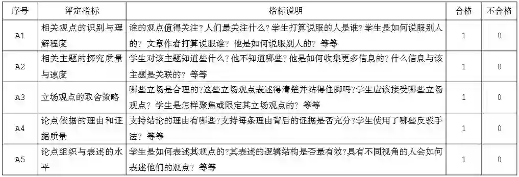 解决PBL等测评问题的一个常用办法,就是针对不同年龄特点和不同类型的PBL,研发相应的评定量表。例如,在研制“学生是如何分析某个论点”的评定量表时,我们可以参照CBAL的框架,设计一个如表2所示的学生论点分析水平之评定量表。