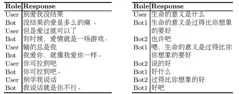 表5. 人机交互示例 (左)和 模型互相交互示例(右)