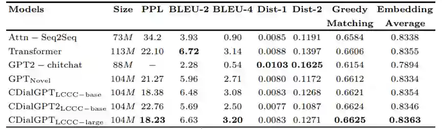 为促进中文对话预训练模型的发展,我们基于LCCC数据集预训练了大规模中文对话生成模型CDial-GPT。该模型的训练过程包含两个阶段,首先,我们在总计5亿字符、包含各类题材的小说数据上训练得到了一个中文小说GPT预训练模型,然后在该模型的基础上,我们使用LCCC中的对话数据继续对模型进行训练,最终得到了中文对话预训练模型CDial-GPT。