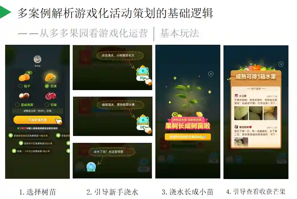 而在种果、浇水、得到水果的过程中,我们就可以真实感受到用游戏化思维、八角行为法则 去策划活动 的优势: