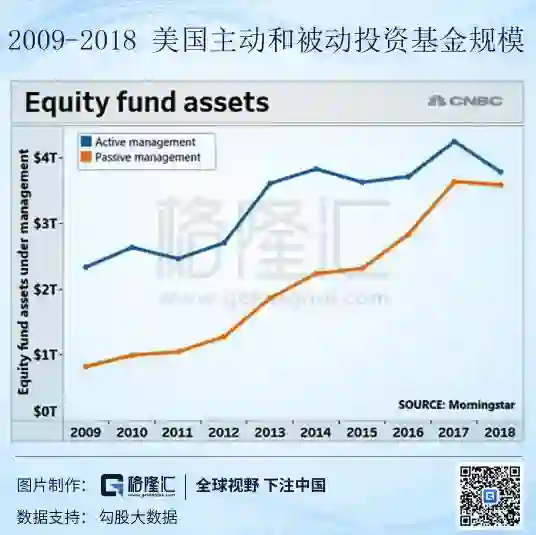 指数基金交易成本低、投资方便、投资门槛低,关键是,收益率还能跑赢大多数的主动型基金,集诸多优点于一身,深受投资者青睐。在这样的背景之下,美国被动投资基金迎来了“黄金十年”,被动投资基金的规模从2009年的不到9000亿美元提升至2018年的3.4万亿美元,当然这是后话。