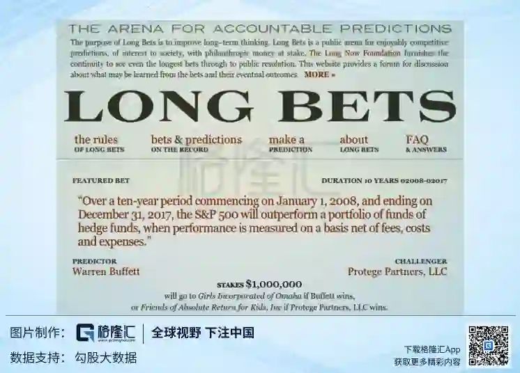 一个残酷的事实是,大多数对冲基金的收益率都是跑不赢指数的。为了证明这一点,2007年12月19日,巴菲特在LongBets网站上发布“十年赌约”,以50万美金为赌注,如果谁有信心建立一个对冲基金的组合,在2008年1月1日~2017年12月31日的十年间,跑赢标普500指数,谁就能拿走赌池中的100万美金。