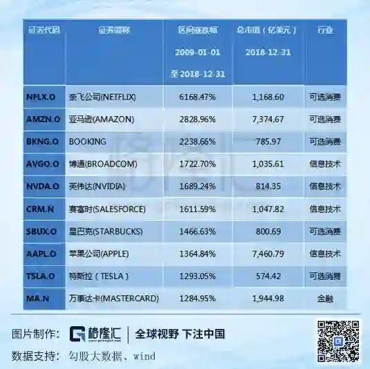 我们选取2009-2018年这十年为时间区间,截止日市值大于500亿美元为市值区间,因为我们的目的不仅是为了找到涨幅最高的公司,还想要找到优质的公司,正是它们拥有改变世界的力量。