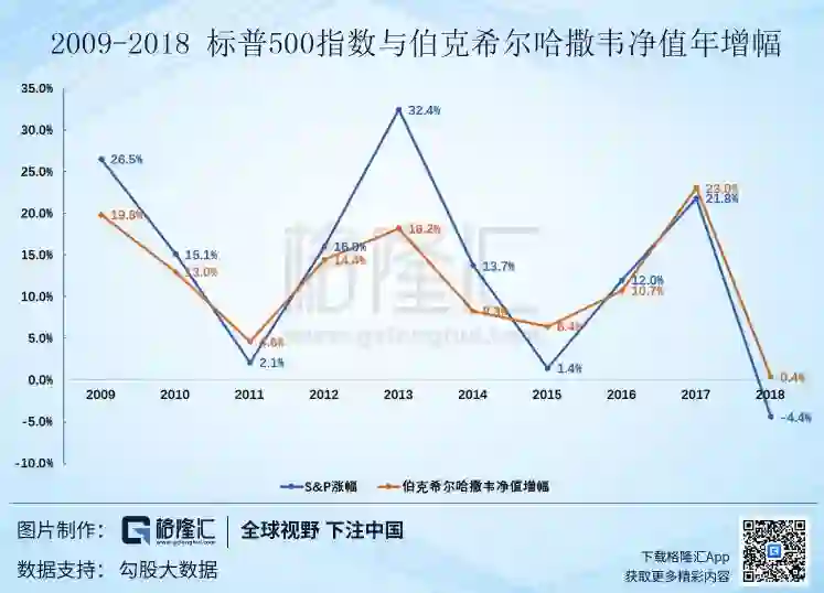 实际上,连巴菲特自己也不得不成为2009-2018年这十年牛市的一个注脚。回过头看伯克希尔哈撒韦在这十年中的净值增长,也仅仅有2011、2015、2017、2018这四年跑赢了大盘。总的来说,巴菲特在这十年的年化收益率大约为11.7%,而同期标普500指数的年化收益则来到了13.1%。